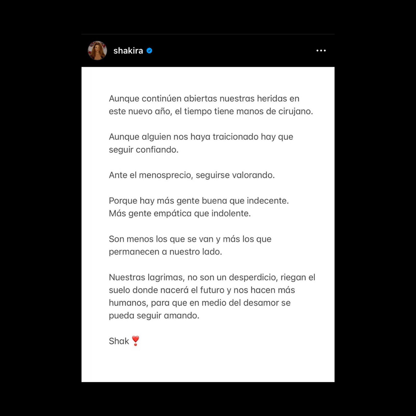 وقالت شاكيرا في رسالتها: "في خضم الحزن يمكننا الاستمرار في الحب.. حتى لو تعرضنا للخيانة من شخص.. يجب أن نستمر بالثقة بالآخرين.. على الرغم من أن جروحنا لا تزال مفتوحة في هذا العام الجديد، إلا أن الوقت بيده دواء الجراح..في مواجهة الازدراء، استمر في تقييم نفسك.. لأن هناك أناسًا طيبين أكثر من الأشرار.. الناس أكثر تعاطفا.. هناك عدد أقل ممن يغادرون والكثير ممن بقوا إلى جانبنا".