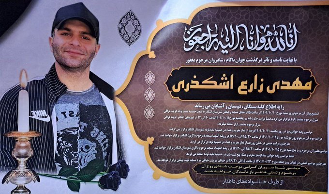 وقالت منظمة حقوق الإنسان الكردية الإيرانية "هانا"، إن "مهدي زارع أشكذري، الذي اعتقل لمشاركته في احتجاجات في طهران وبسبب التعذيب دخل في غيبوبة بعد ساعات من إطلاق سراحه المؤقت، وتوفي في المستشفى".