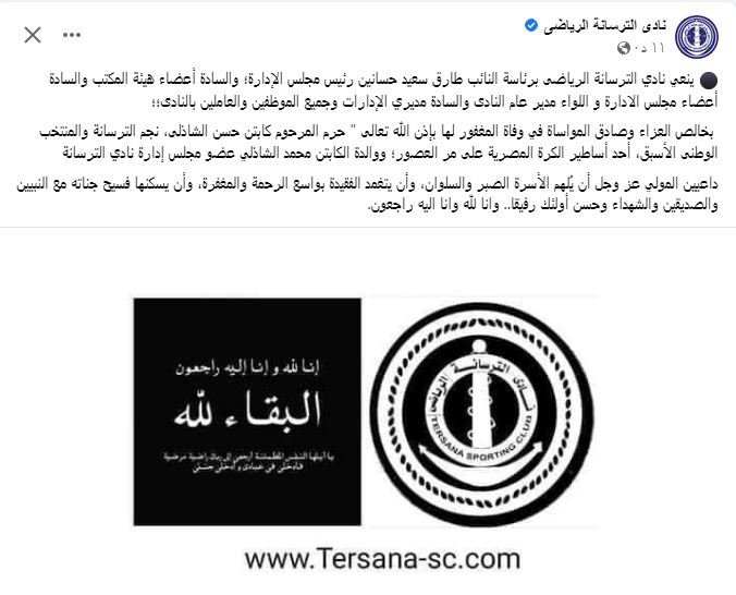 وفاة زوجة حسن الشاذلي، نعى نادي الترسانة الرياضى برئاسة النائب طارق سعيد حسانين رئيس مجلس الإدارة؛ وأعضاء هيئة المكتب وأعضاء مجلس الادارة واللواء مدير عام النادى ومديري الإدارات وجميع الموظفين والعاملين بالنادى؛ زوجة حسن الشاذلي.