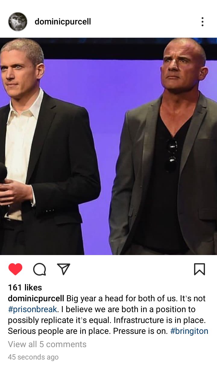 وكشفت الممثل الشهير دومينيك بورسيل، عن الخبر السار، عبر صفحته الرسمية علي موقع الصور والفيديوهات “انستجرام”، حيث نشرة صورة يظهر فيها بصحبه الممثل وينتورث ميلر، وأفقها بتعليق قائلا:" 2023. سنة كبيرة رأس لكلينا. انها ليست prison break.. أعتقد أن كلانا في وضع يسمح له بتكرار الأمر على قدم المساواة.. البنية التحتية في مكانها الصحيح.. الناس الجادين في مكانهم.. الضغط مستمر…اجلبه.