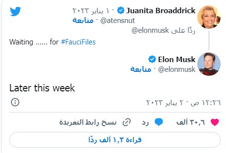 وقال ماسك في تغريدته على تويتر:" آمل أن يكون يومكم رائعا في 1 2023. هناك شيء واحد مؤكد، لن يكون مملا". وردت إحدى المتابعات عليه قائلة إنها تنتظر أن يكشف عن "FauciFiles".