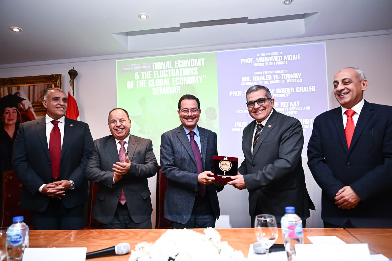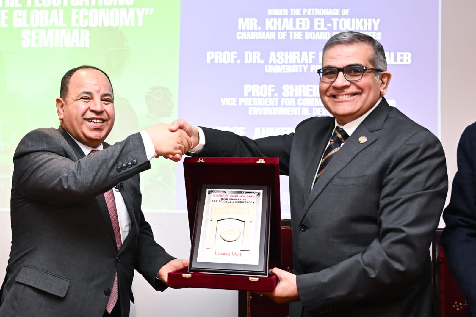 نظمت كلية الإدارة والاقتصاد بجامعة مصر للعلوم والتكنولوجيا ندوة تحت عنوان"الاقتصاد الوطني وتقلبات الاقتصاد العالمي"، بحضور د. محمد معيط وزير المالية، حيث قام الدكتور أشرف حيدر غالب رئيس جامعة مصر للعلوم والتكنولوجيا، باستقبال وزير المالية، في الندوة التى أقيمت برعاية خالد الطوخي رئيس مجلس الأمناء، وبحضور الدكتور شريف رفعت نائب رئيس الجامعة لشئون خدمة المجتمع وتنمية البيئة، وعدد من عمداء الجامعة.