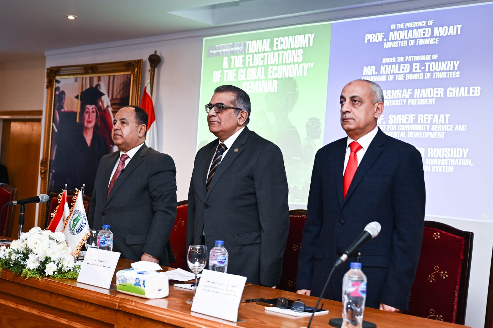 ورحب الدكتور أشرف حيدر بوزير المالية الدكتور محمد معيط، ونقل تحية رئيس مجلس الأمناء خالد الطوخي للحضور، كما رحب بالضيوف وشكرهم على المشاركة في الندوة التي تنظمها الجامعة كنوع من المشاركة المجتمعية التي تساهم في رفعة وتنمية المجتمع خاصة مع فتح الحوار عن وضع الاقتصاد المصري وتأثره بالاقتصاد العالمي، كما رحب بوجود وزير التنمية الإدارية ورئيس الهيئة الاقتصادية لقناة السويس السابق، الدكتور أحمد درويش، مؤكدا أن الندوة تطرح كيفية مواجهة الدولة للتحديات التي تواجهها وكيفية التفاعل مع المؤثرات الخارجية في نقاط هامة جدا.