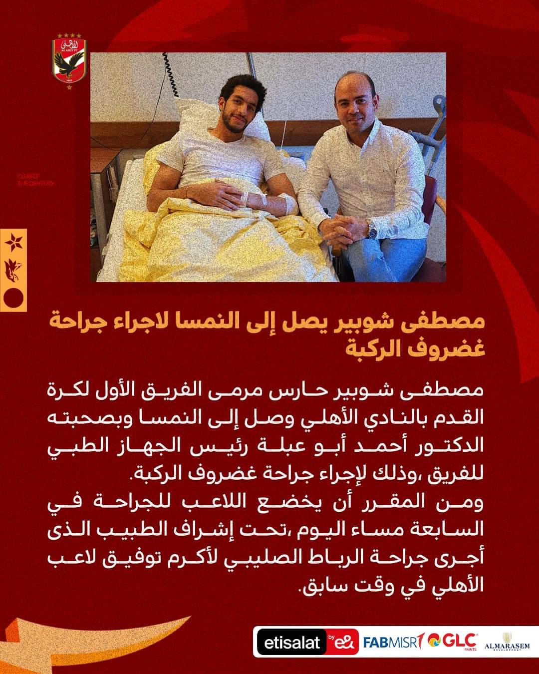 وينتظر أن يخضع مصطفي شوبير لجراحة غضروف الركبة في السابعة مساء اليوم حيث تم الاتفاق على ذلك مع طبيب الأهلي.