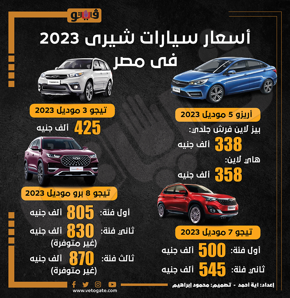 أسعار سيارات شيرى 2023 فى مصر (إنفوجراف) الإثنين 02/يناير/2023 - 07:05 م 1/2/2023 7:05:39 PM سيارات شيرى، فيتو آية أحمد شارك طباعة 18 حجم الخط شارك طباعة شيري أريزو 5 شيري اريزو شيري تيجو 7 شيري تيجو 3 شيري تيجو 8