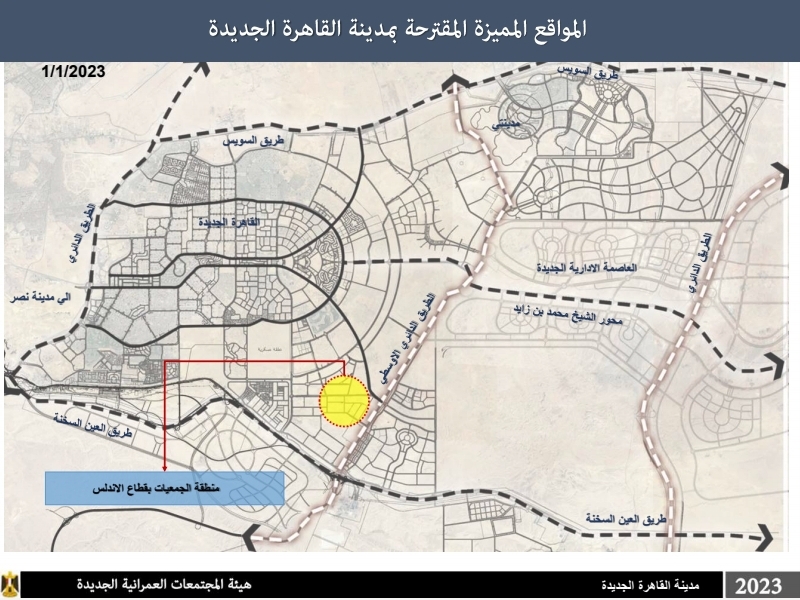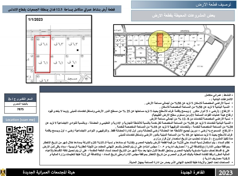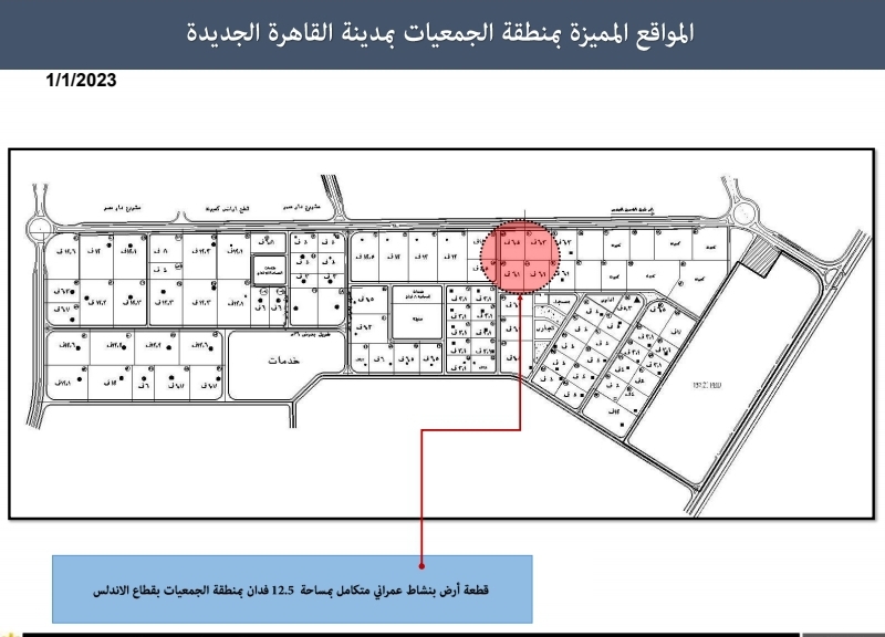 وحددت هيئة المجتمعات العمرانية الجديدة بمدينة القاهرة الجديدة قطعة أرض بنشاط عمرانى متكامل بمساحة 12.5 فدان بمنطقة الجمعيات بقطاع الأندلس وسعرها التقديري 7875 جنيه مصري للمتر المربع.