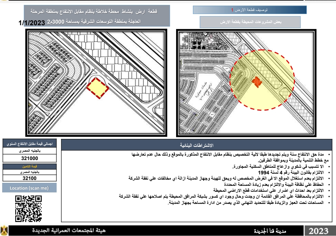 وحددت هيئة المجتمعات العمرانية الجديدة بمدينة قنا الجديدة بنظام مقابل الانتفاع قطعة أرض بنشاط محطة خلاطة بمنطقة المرحلة العاجلة بمنطقة التوسعات الشرقية بمساحة 23000 وإجمالي قيمة الانتفاع السنوي 321000 جنيه مصري وقيمة تأمينية 32100 جنيه مصري.