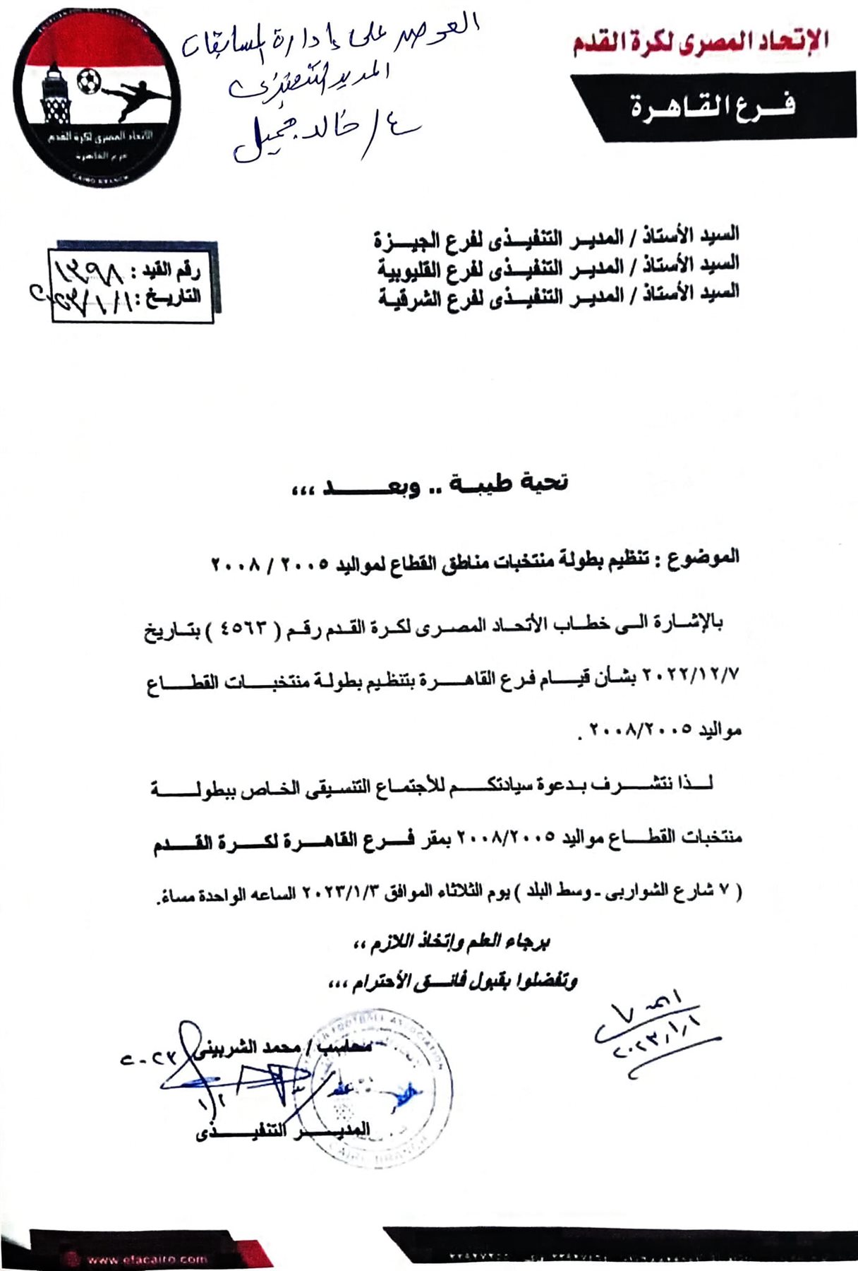 وأكد اتحاد الكرة في خطابه لفروع القاهرة والجيزة والقليوبية والشرقية، إعداد وتجهيز منتخب الفرع مواليد 2005 و2008 للاشتراك في بطولة منتخبات مناطق القطاعات.