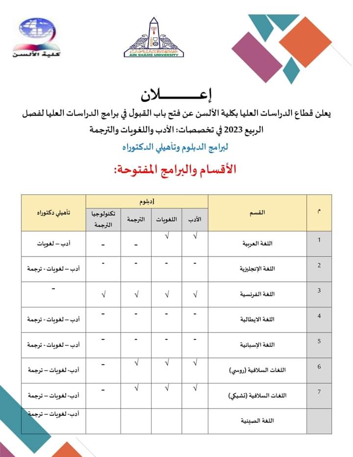 أعلن قطاع الدراسات العليا بكلية الألسن جامعة عين شمس، فتح باب القبول في برامج الدراسات العليا لفصل الربيع 2023 في تخصصات: الأدب واللغويات والترجمة، لبرامج الدبلوم وتأهيلي الدكتوراه.