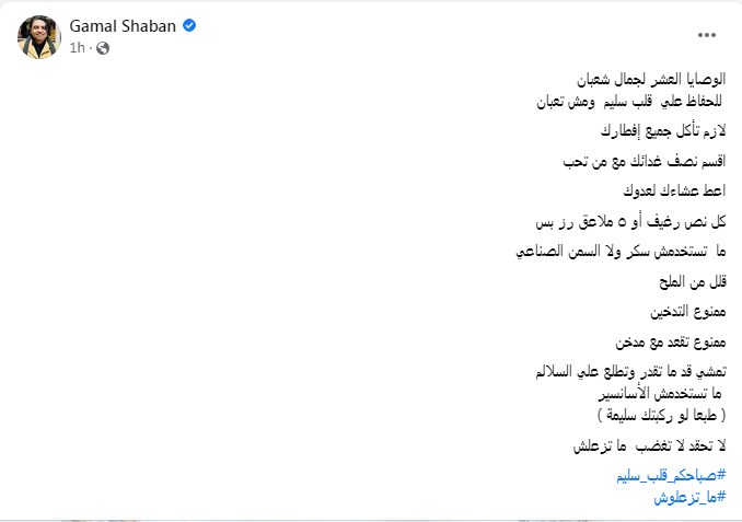 وعن الحفاظ على القلب سليم كتب الدكتور جمال شعبان بعض الوصايا في تدوينة على الفيس بوك "الوصايا العشر لجمال شعبان للحفاظ علي قلب سليم ومش تعبان".