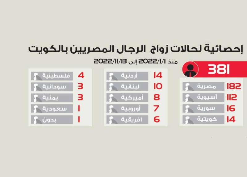 وأشار تقرير صحيفة الرأي إلى أن عدد زيجات المصريين من الكويتيات بلغ 14 حالة في فترة ال11 شهر، بينما بلغت عدد حالات زواج المصريين من الجنسيات الأخرى 14 كويتية و16 سورية و14 أردنية و10 لبنانيات.