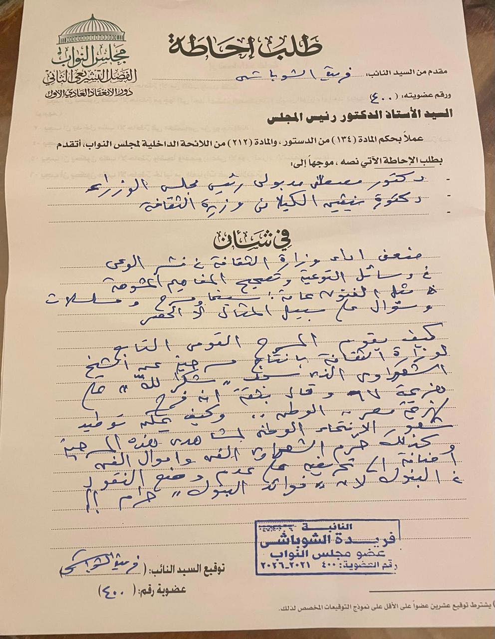 تقدمت النائبة فريدة الشوباشي، عضو مجلس النواب، بطلب إحاطة للدكتور مصطفي مدبولي، رئيس مجلس الوزراء، والدكتورة نيفين الكيلاني وزيرة الثقافة في شأن ضعف أداء وزارة الثقافة في نشر الوعي في وسائل التوعية وتصحيح المفاهيم المشوهة مثل الفنون عامة "سينما - مسرح - مسلسلات".