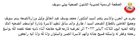 ونشرت مديرية الصحة ببني سويف، بيانًا، على صفحتها بـ"فيسبوك" جاء فيه: بمزيد من الحزن والاسي ينعي الدكتور محمد يوسف عبد الخالق وكيل وزارة الصحة ببني سويف وجميع العاملين بالقطاع الصحي "طارق والي" سائق تنظيم الأسرة بإدارة الواسطى الصحية، الذى وافته المنية، اليوم الثلاثاء، إثر تعرضه لازمة قلبية مفاجئة، أثناء تادية عمله "تغمده الله بواسع رحمته وغفر له واسكنه فسيح جناته وألهم الأسرة الصبر والسلوان، وانا لله وانا اليه راجعون".