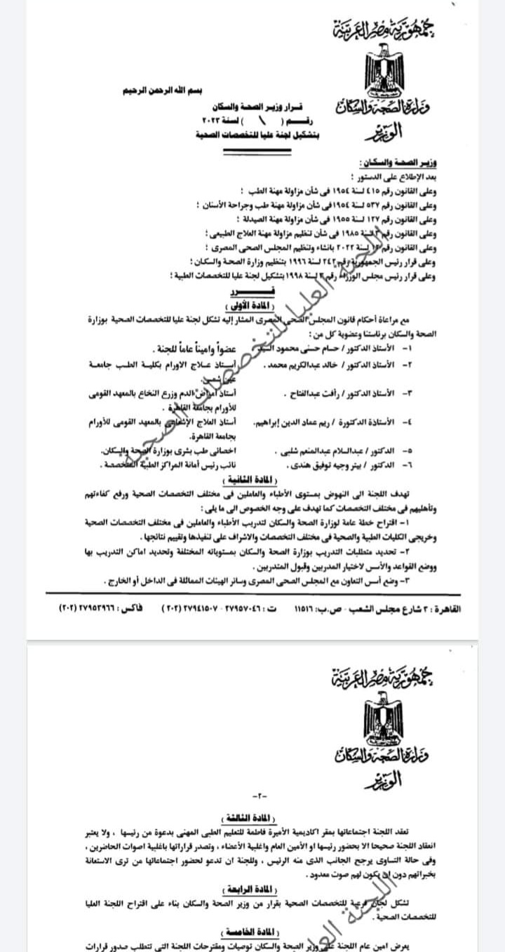 اللجنة العليا للتخصصات الطبية، أول قرار لوزير الصحة في 2023