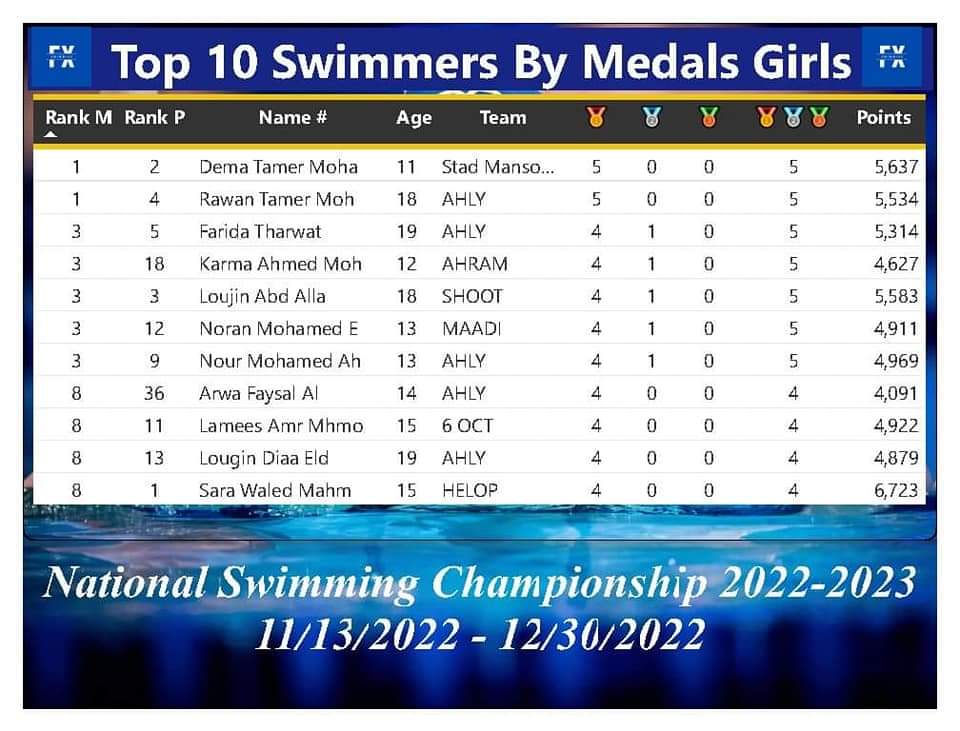 البطله ديما تامر محمد حصلت على المركز الأول في ترتيب السباحات في بطولة الجمهورية في جميع المراحل بعدد خمس ميداليات ذهبية وكأس أحسن سباحه وكأس أحسن رقم لمرحلة ١١ سنة بنات.
