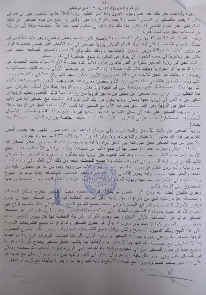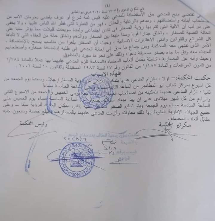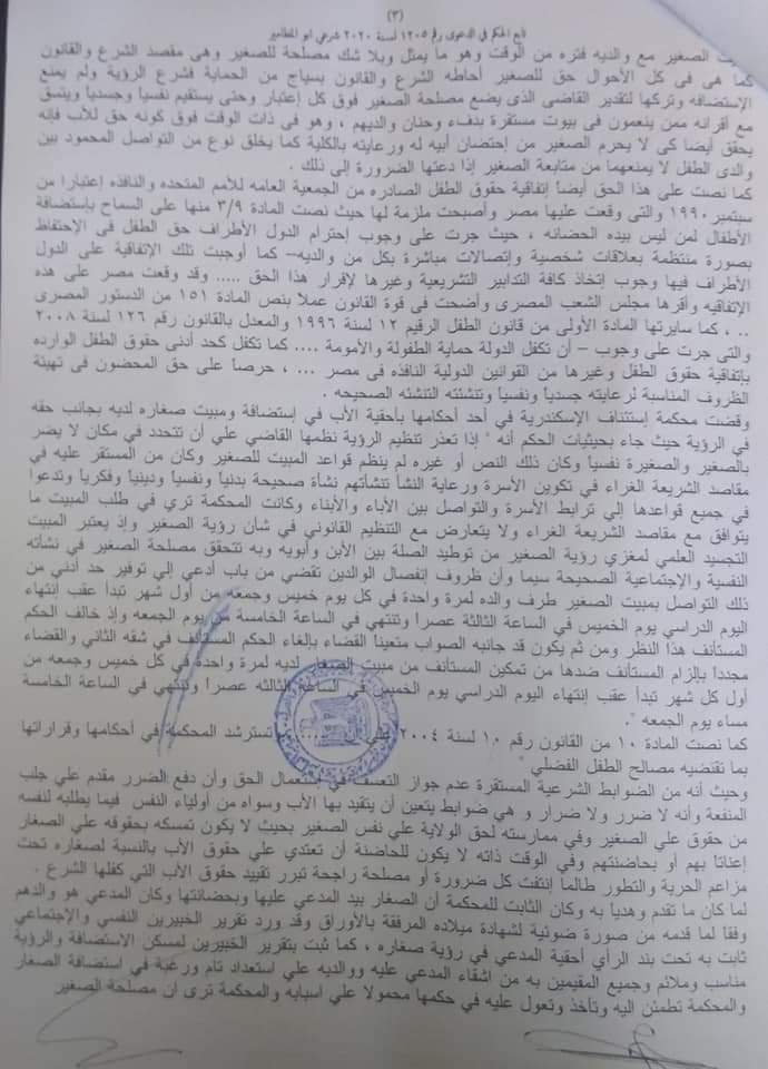 ولهذه الاسباب حكمت المحكمة - أولا: بالزام المدعي عليها بتمكين الأب من رؤية الصغار يوم الجمعة من كل اسبوع بمركز شباب ابو المطامير من الساعة الثانية مساء وحتى الساعة الخامسة مساءا.