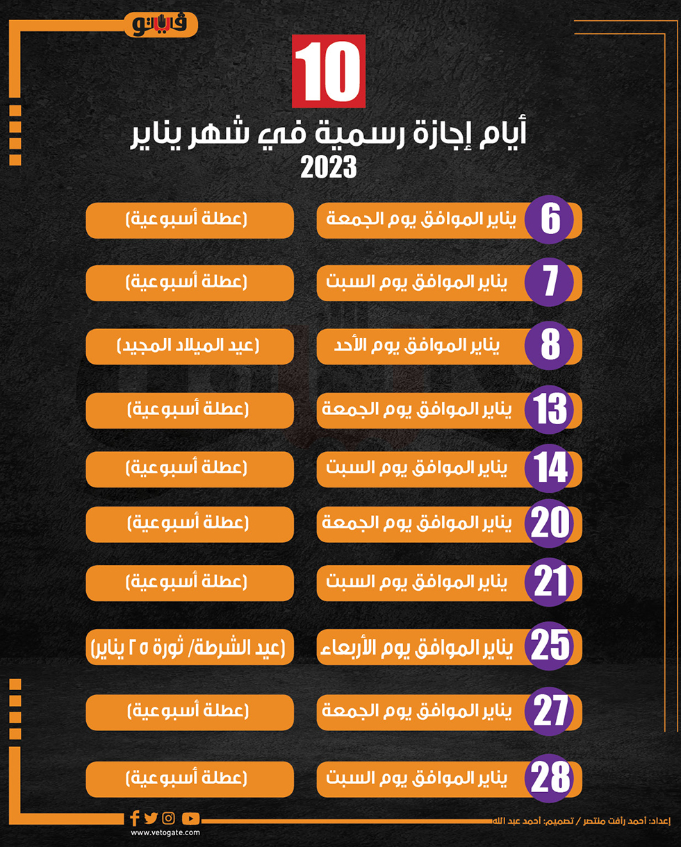 10 أيام إجازة رسمية في شهر يناير 2023 (إنفوجراف) الأربعاء 04/يناير/2023 - 03:26 م 1/4/2023 3:26:04 PM اجازات شهر يناير 2023، فيتو أحمد رأفت منتصر شارك طباعة 18 حجم الخط شارك طباعة الإجازات الرسمية 2023 الإجازات الرسمية خلال 2023 الإجازات الرسمية يناير 2023 اجازات 2023 الإجازات الرسمية خلال عام 2023