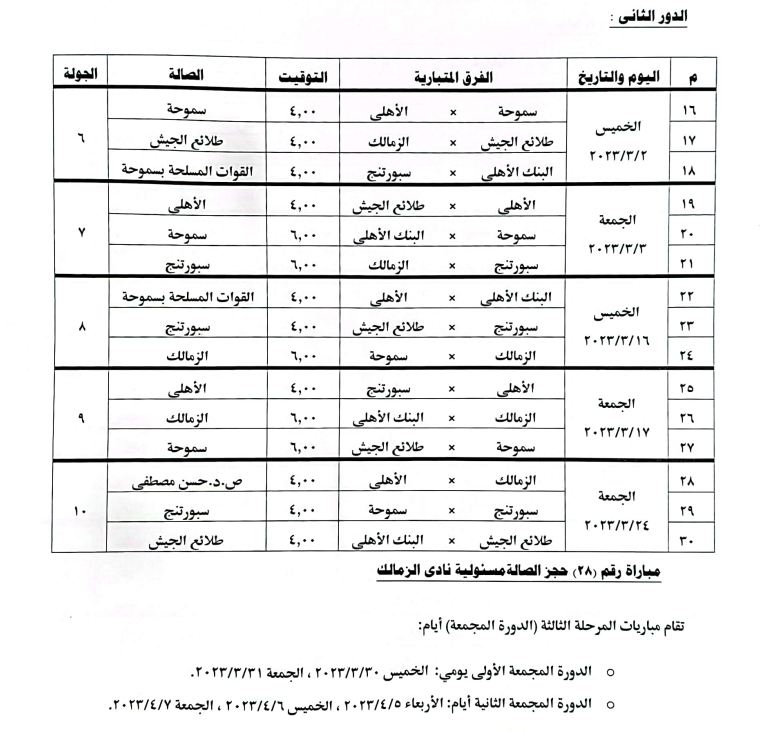 وأعلن اتحاد كرة اليد أن انطلاق الدور الثاني من المرحلة الثانية لـ دوري كرة اليد سيكون يوم 9 مارس المقبل، وجاء جدول الدور الثاني كالتالي: