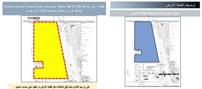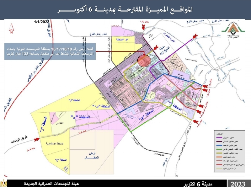 وحددت هيئة المجتمعات العمرانية بمدينة ٦ أكتوبر قطعة أرض رقم 16/17/18/19 بمنطقة المؤسسات الدولية بامتداد التوسعات الشمالية بنشاط عمراني متكامل بمساحة 133 فدانًا تقريبًا وسعرها التقديري 3140 جنيهًا مصري للمتر²