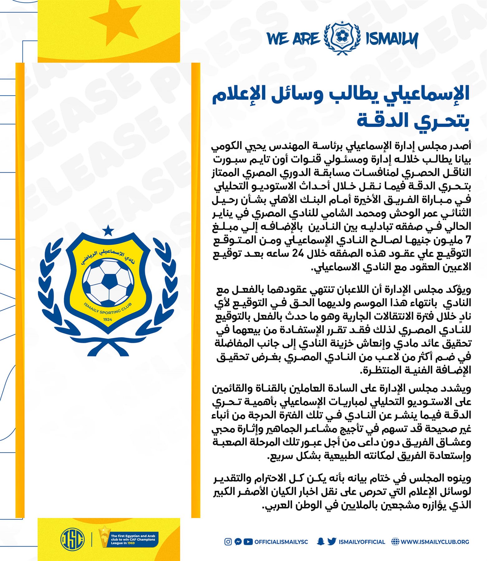 أصدر مجلس إدارة الإسماعيلي برئاسة المهندس يحيي الكومي بيانا يطالب خلاله إدارة ومسئولي قنوات أون تايم سبورت الناقل الحصري لمنافسات مسابقة الدوري المصري الممتاز بتحري الدقة فيما نقل خلال أحداث الاستوديو التحليلي في مباراة الفريق الأخيرة أمام البنك الأهلي.