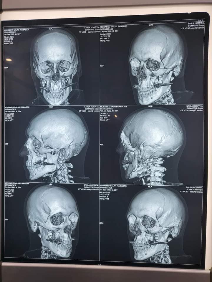 وبعد عمل الفحوصات الطبية اللازمة اكد الطبيب المعالج بان اللاعب يحتاج إلي تدخل جراحي لتركيب شرائح ومسامير وشبكة داعمة لتثبيت عظام الوجه