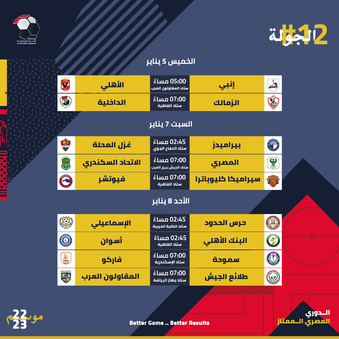 الدوري المصري الممتاز، مواعيد مباريات الجولة الـ12