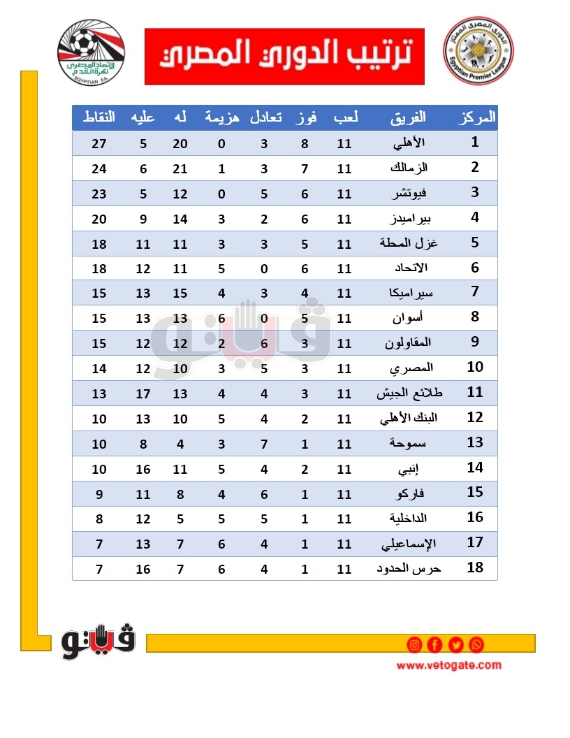 ترتيب الدوري المصري الممتاز قبل انطلاق الجولة الـ12