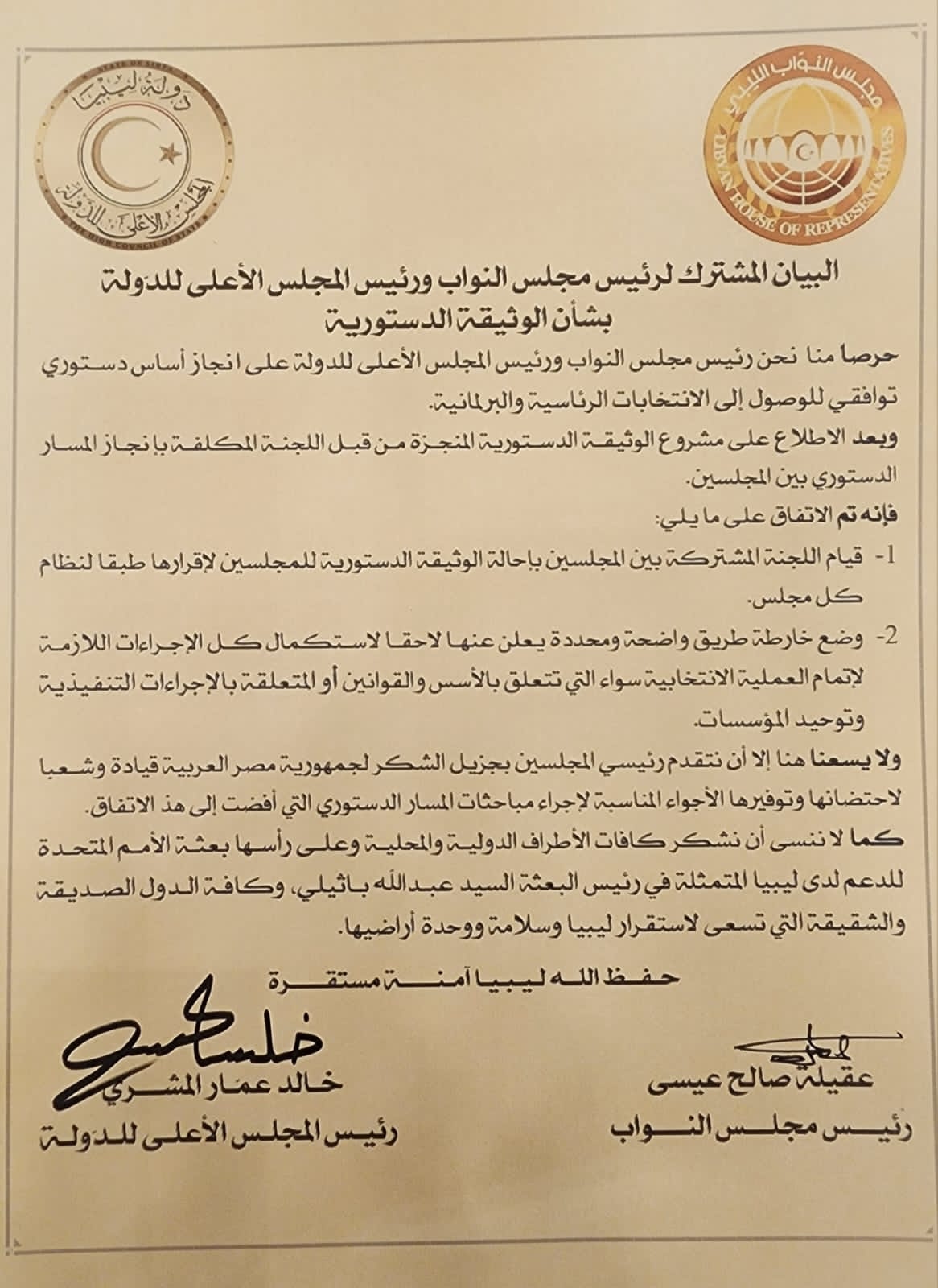 وجاء البيان المشترك لرئيس مجلس النواب ورئيس المجلس الأعلى للدولة بشأن الوثيقة الدستورية "حرصا منا نحن رئيس مجلس النواب ورئيس المجلس الأعلى للدولة على انجاز أساس دستوري توافقي للوصول إلى الانتخابات الرئاسية والبرلمانية.