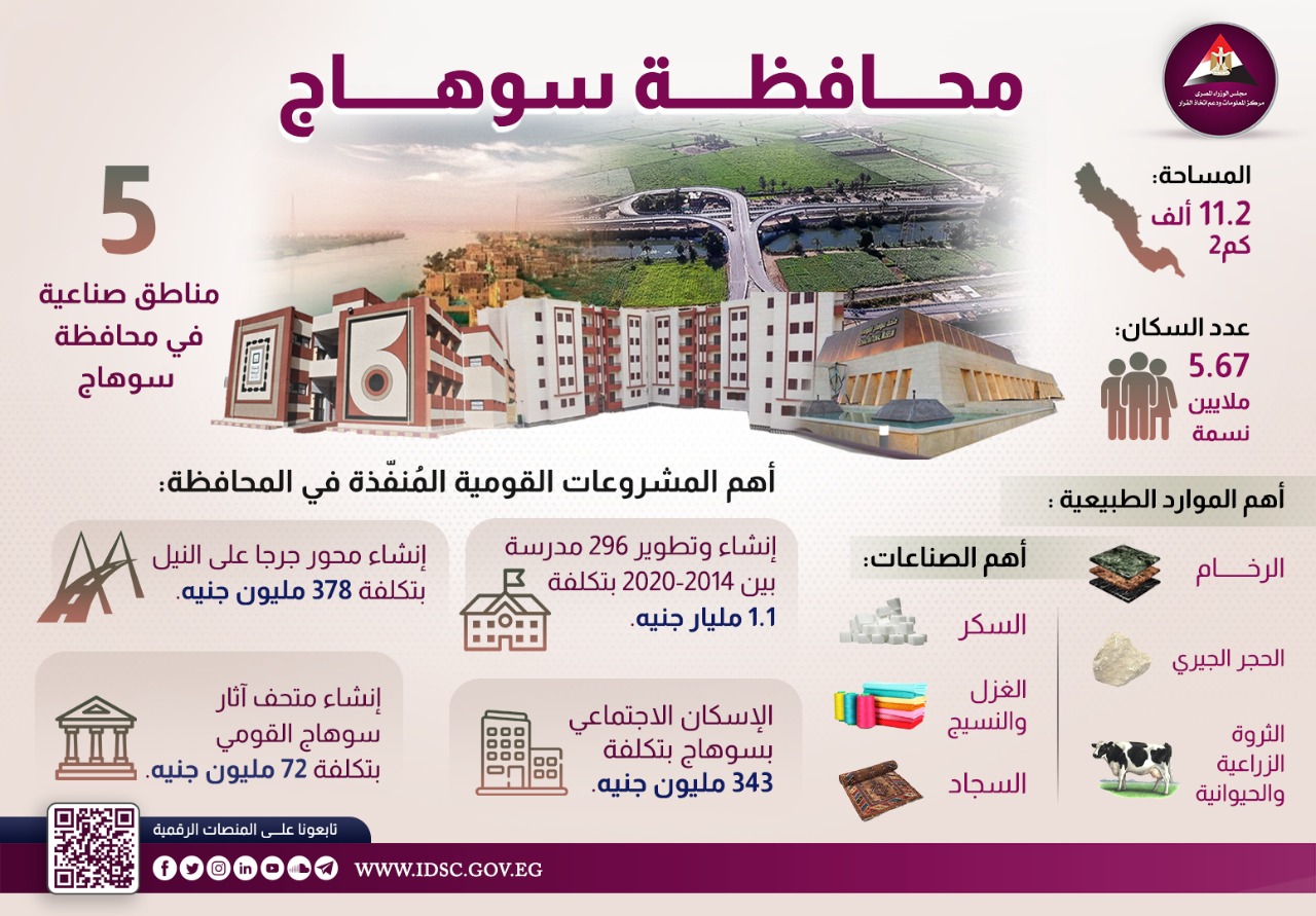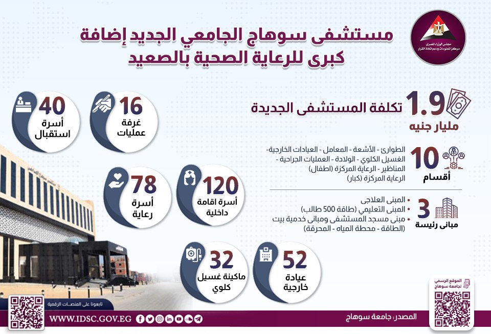 نشر مركز المعلومات ودعم اتخاذ القرار بمجلس الوزراء، إنفوجراف جديد عبر صفحته الرسمية على موقع التواصل الاجتماعي فيس بوك تحت عنوان "مستشفي سوهاج الجامعي الجديد إضافة كبري للرعاية الصحية بالصعيد".