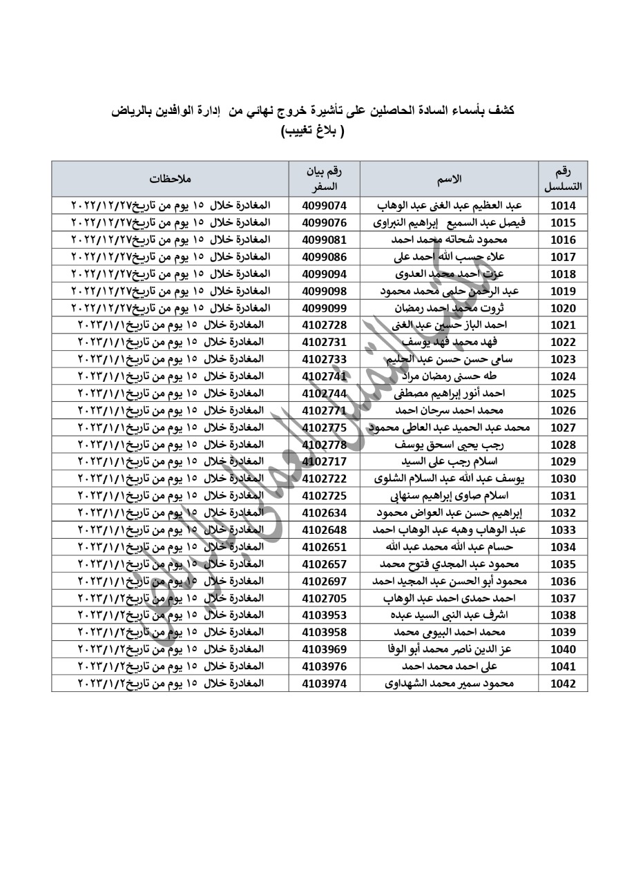 وجاء في التقرير الذي تلقاه وزير القوى العاملة حسن شحاتة،من أحمد رجائي المستشار العمالي بسفارة جمهورية مصر العربية بالرياض، أن القائمة تضم: 37 تأشيرة خروج نهائي وإبعاد لمن لديهم الرغبة في العودة إلى مصر، ممن انتهت اقامتهم ولم يقوم صاحب العمل بالتجديد لهم، و29 تأشيرة خروج نهائى تهرب عن العمل ولا يمكنه العودة للسعودية مرة أخرى إلا بعد مرور 5 سنوات، وجاء فى القائمة عدد 8 من العاملين الذين تعذر إتمام تأشيرة الخروج النهائي لهم نظرًا لوجود ملاحظات تمنعهم من السفر، كما تم مراجعة مكتب العمل لإنهاء عدد 15 طلب خروج نهائي للعاملين المصريين الذين انتهت إقامتهم ولم يتمكنوا من تجديد إقامتهم ويرغبون فى الخروج النهائي النظامى إلا أنه تبين وجود بعض الملاحظات التى تمنعهم من الحصول على موافقة مكتب العمل بالخروج النهائي.