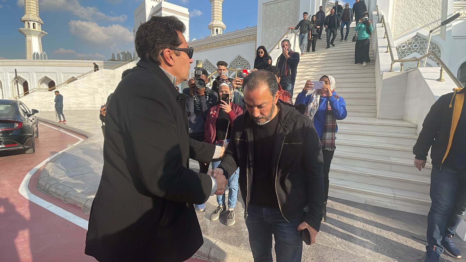 حرص الفنان هاني رمزي على الحضور إلى مسجد الشرطة بمنطقة التجمع الخامس لحضور تشييع جنازة والدة الفنان طارق لطفي التي توفيت صباح اليوم الخميس.