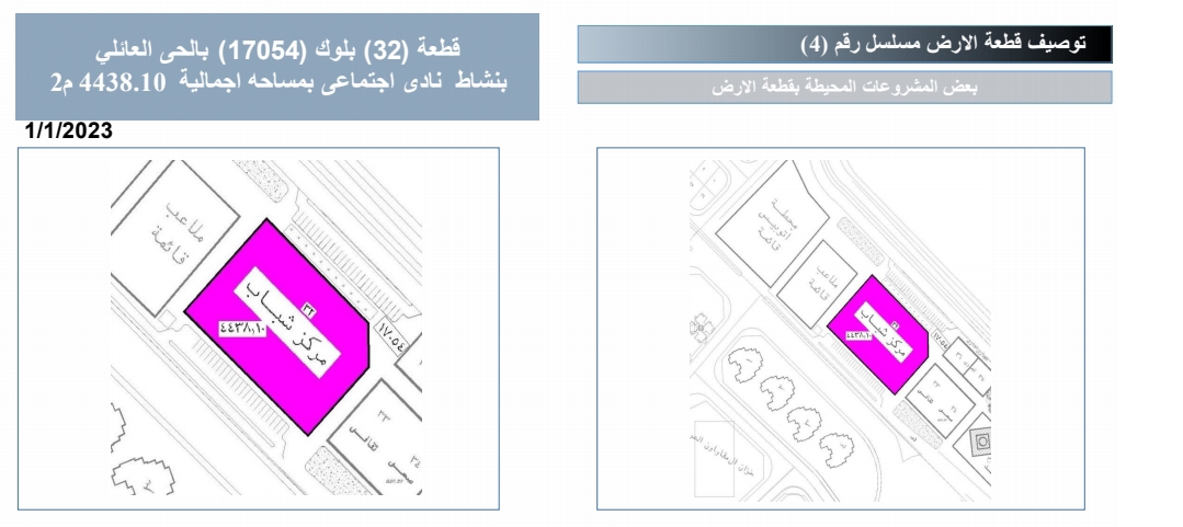 قطعة (32) بلوك (17054) بالحى العائلي بنشاط نادی اجتماعی بمساحة اجمالية 4438.10 م2 وسعرها التقديري 3070 جنيه مصري للمتر²