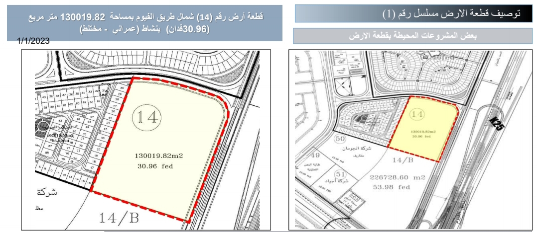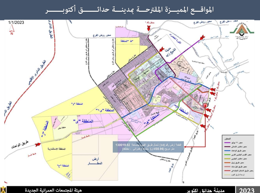 وحددت هيئة المجتمعات العمرانية الجديدة بمدينة حدائق أكتوبر قطعة أرض رقم (14) شمال طريق الفيوم بمساحة 130019.82 متر مربع (30.96 فدان) بنشاط ( عمراني - مختلط) وسعرها التقديري 5460 جنيه مصري للمتر².