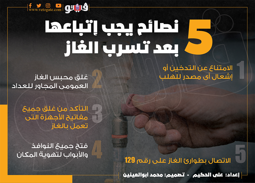 5 نصائح يجب إتباعها بعد تسرب الغاز (إنفوجراف) الجمعة 06/يناير/2023 - 02:05 م 1/6/2023 2:05:28 PM تسرب غاز، فيتو على الحكيم شارك طباعة 18 حجم الخط شارك طباعة الإمتناع عن التدخين طوارئ الغاز الحوادث اخبار الحوادث