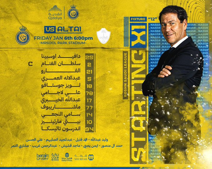 أما تشكيلة مدرب الطائي البرتغالي بيدرو دا كوستا فضمت الأسماء التالية لمواجهة النصر في الدوري السعودي: