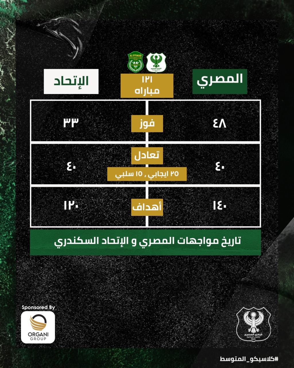 وحقق فريق المصري الفوز في 48 مباراة مقابل 33 فوز للاتحاد السكندري وتعادلا في 40 مباراة منهما 25 تعادلا إيجابيا و15 تعادلا سلبيا.