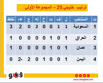 خليجي 25، جدول ترتيب مجموعة السعودية والعراق بعد الجولة الأولى