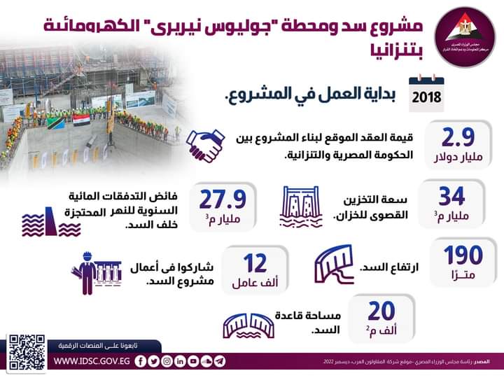 نشر مركز المعلومات ودعم اتخاذ القرار بمجلس الوزراء، إنفوجراف جديد يتضمن معلومات حول سد ومحطة جوليوس نيريري الكهرومائية في تنزانيا، في إطار اهتمام مصر بتوطيد علاقاتها بالأشقاء الأفارقة.