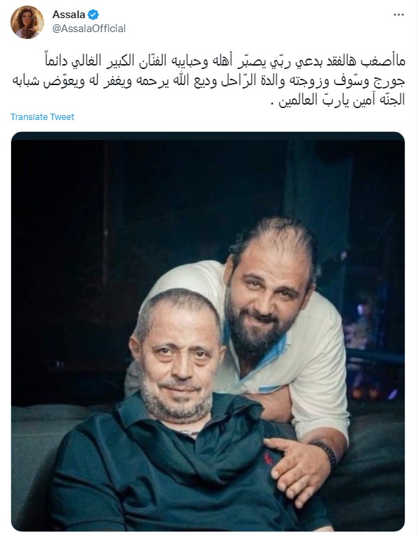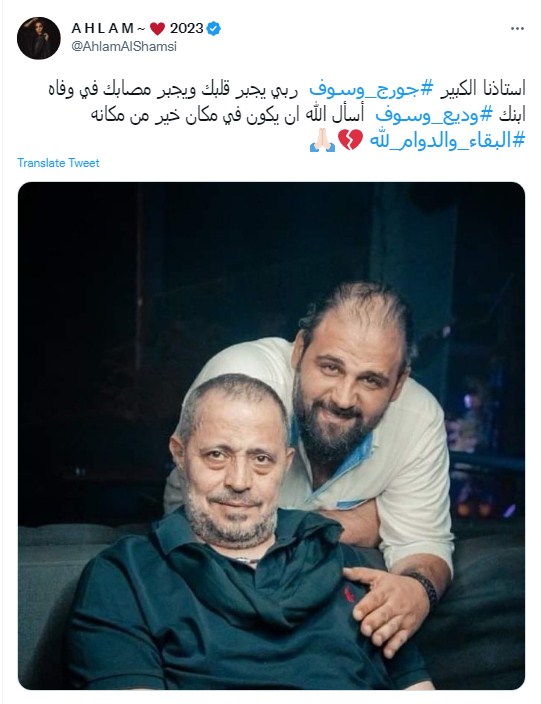 أما الفنانة أحلام فنعته قائلًا: "استاذنا الكبير #جورج_وسوف ربي يجبر قلبك ويجبر مصابك في وفاه ابنك #وديع_وسوف أسأل الله ان يكون في مكان خير من مكانه #البقاء_والدوام_لله"