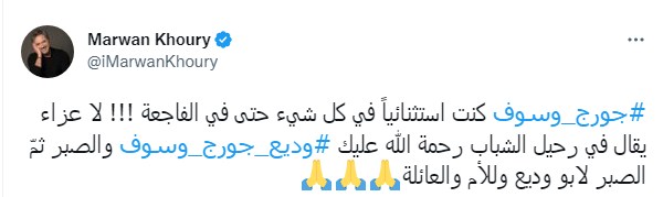 وكانت كلمات مروان خوري استثنائية حيث قال: "#جورج_وسوف كنت استثنائيًا في كل شيء حتى في الفاجعة ! لا عزاء يقال في رحيل الشباب رحمة الله عليك #وديع_جورج_وسوف والصبر ثمّ الصبر لابو وديع وللأم والعائلة"