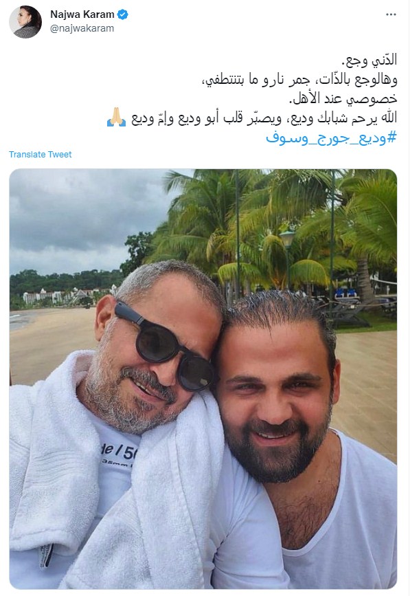 وعبرت نجوي كرم عن حزنها فقالت: "الدّني وجع. وهالوجع بالذّات، جمر نارو ما بتنتطفي، خصوصي عند الأهل. الله يرحم شبابك وديع، ويصبّر قلب أبو وديع وإمّ وديع #وديع_جورج_وسوف"