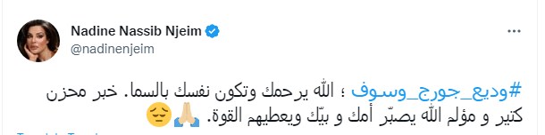 كما عبرت نادين نجيم عن حزنها فقالت: "#وديع_جورج_وسوف؛ الله يرحمك وتكون نفسك بالسما. خبر محزن كتير ومؤلم الله يصبّر أمك وبيّك ويعطيهم القوة."