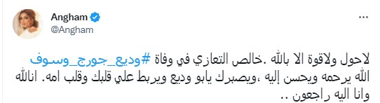 كما نعته أنغام قائلة: " لاحول ولاقوة الا بالله.خالص التعازي في وفاة #وديع_جورج_وسوف الله يرحمه ويحسن إليه، ويصبرك يابو وديع ويربط علي قلبك وقلب امه. انالله وانا اليه راجعون.."