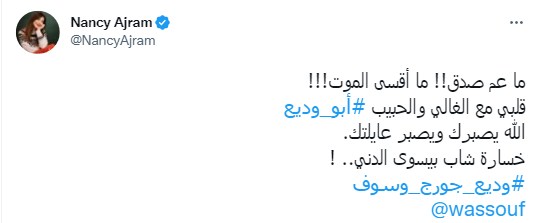 ووصفت الفنانة نانسي عجرم صدمتها قائلة: "ما عم صدق!! ما أقسى الموت!!! قلبي مع الغالي والحبيب #أبو_وديع الله يصبرك ويصبر عايلتك. خسارة شاب بيسوى الدني.. ! #وديع_جورج_وسوف".