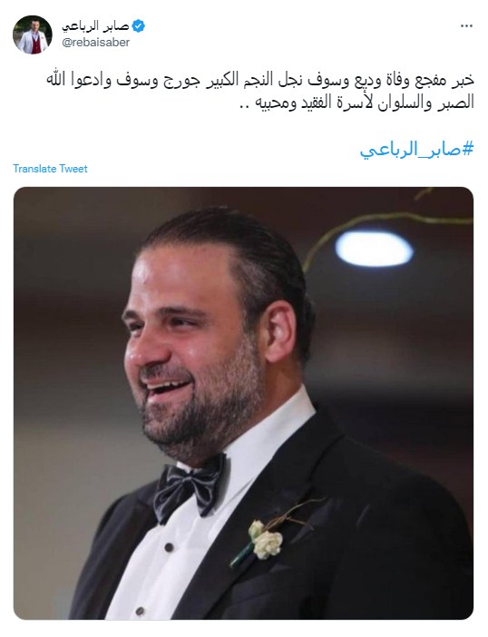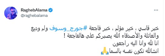 وعبر راغب علامة عن صدمته قائلًا: "خبر قاسي، خير مؤلم، خبر فاجعة #جورج_وسوف وام وديع والعائلة والأصدقاء الله يصبركم على هالفاجعة! انا لله وانا اليه راجعون ان شاء الله تكون نفسه بالسما"