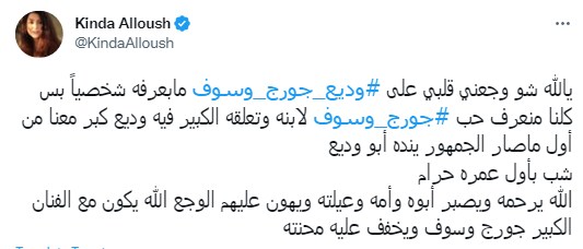 أما كندا علوش فقالت: " يالله شو وجعني قلبي على #وديع_جورج_وسوف مابعرفه شخصيًا بس كلنا منعرف حب #جورج_وسوف لابنه وتعلقه الكبير فيه وديع كبر معنا من أول ماصار الجمهور ينده أبو وديع شب بأول عمره حرام الله يرحمه ويصبر أبوه وأمه وعيلته ويهون عليهم الوجع الله يكون مع الفنان الكبير جورج وسوف ويخفف عليه محنته.. أكيد. سمعانة فيه.. وحتى لو مو سمعانة فيه بترحم عليه.. تعليق غريب وابتسامة غير مفهومة.. حتى بالموت في فزلكة وتنظير"