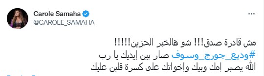 وقالت كارول سماحة: "مش قادرة صدق!!! شو هالخبر الحزين!!!!! #وديع_جورج_وسوف صار بين إيديك يا رب الله يصبر إمك وبيك وإخواتك على كسرة قلبن عليك"
