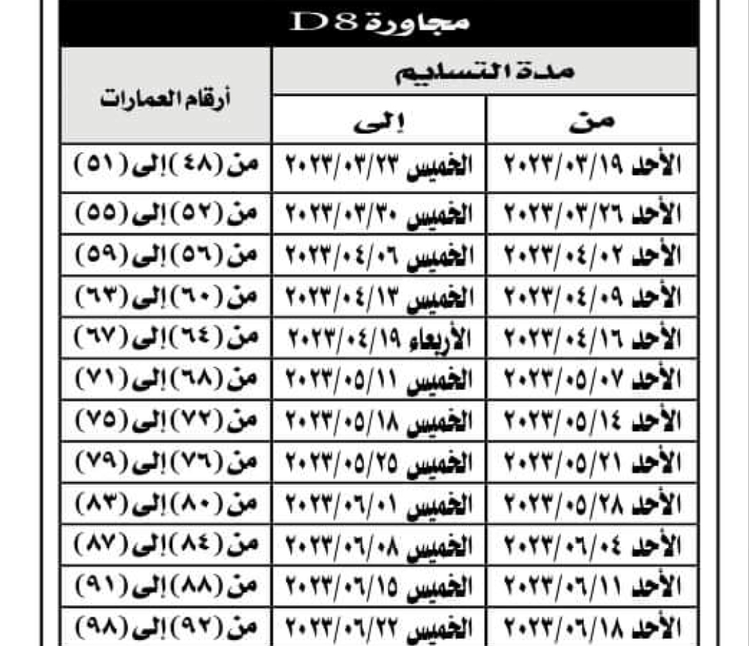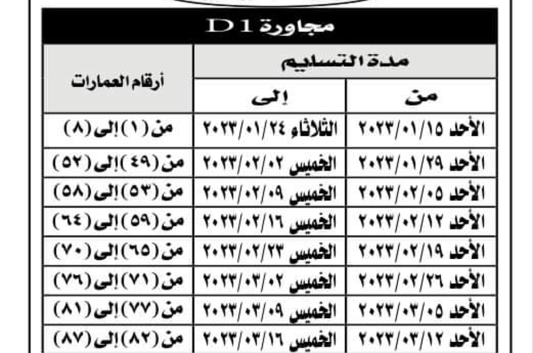 وحددت هيئة المجتمعات العمرانية موعد تسلم الوحدات كما هو موضح بالجدول التالي: