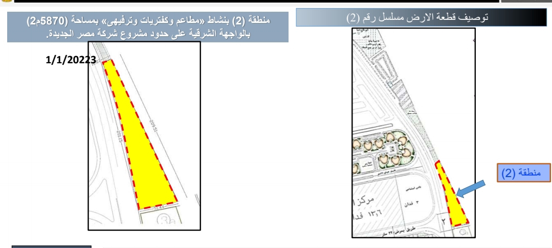 منطقة (2) بنشاط مطاعم وكفتريات وترفيهي بمساحة (5870-2) بالواجهة الشرقية على حدود مشروع شركة مصر الجديدة والقيمة مقابل الانتفاع السنوي 1244450 جنيه مصري وقيمة التامين 124445 جنيه المصري.