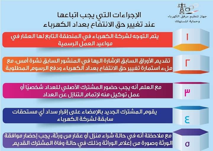 نشر جهاز تنظيم مرفق الكهرباء وحماية المستهلك عبر صفحته الرسمية على موقع التواصل الاجتماعي فيسبوك إنفوجراف جديد تحت عنوان "خطوات تغيير حق الانتفاع بعداد الكهرباء".